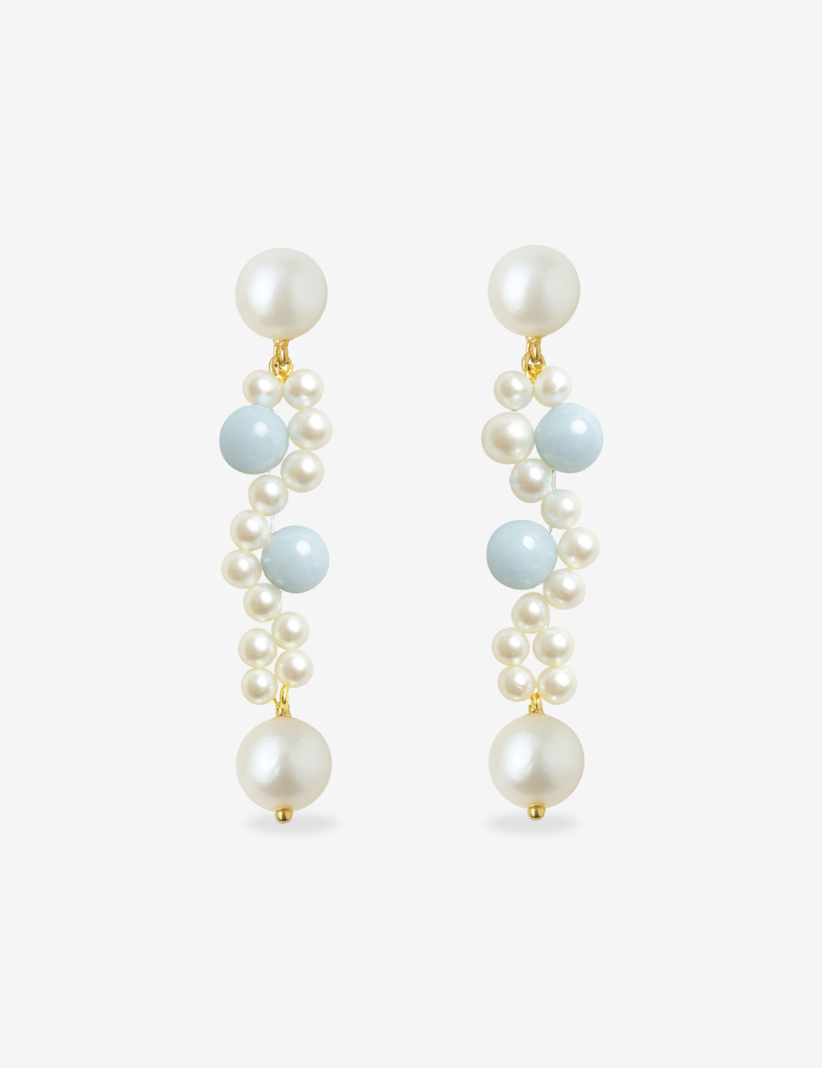 Kollektionen rummer både legende statement-øreringe og enkle silhuetter – fra lange linjer i blå kalcedon til klassiske perlekæder med et strejf af middelhavet.
