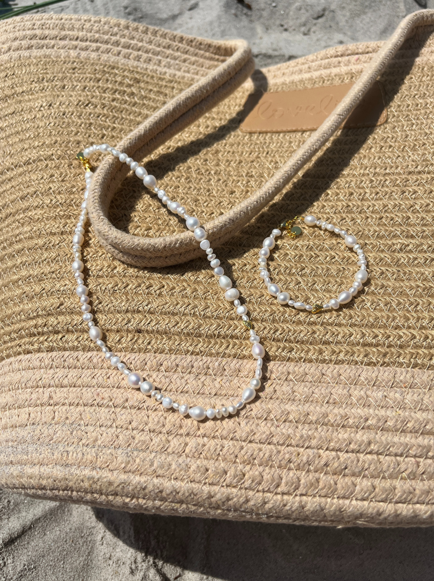 Et legende mix af perler i bløde former og naturens nuancer – sammensat som et lille strandfund af skaller og sten.