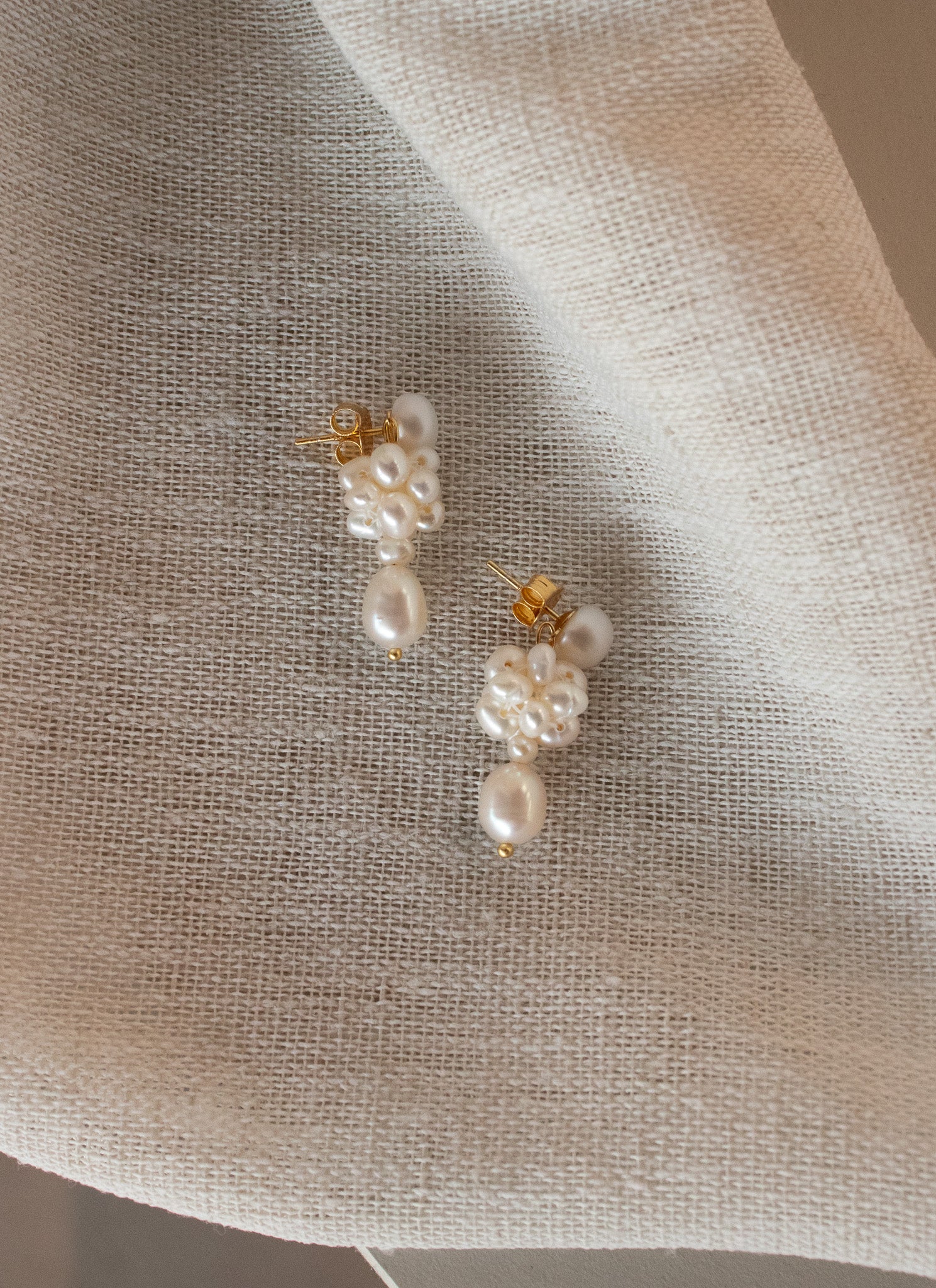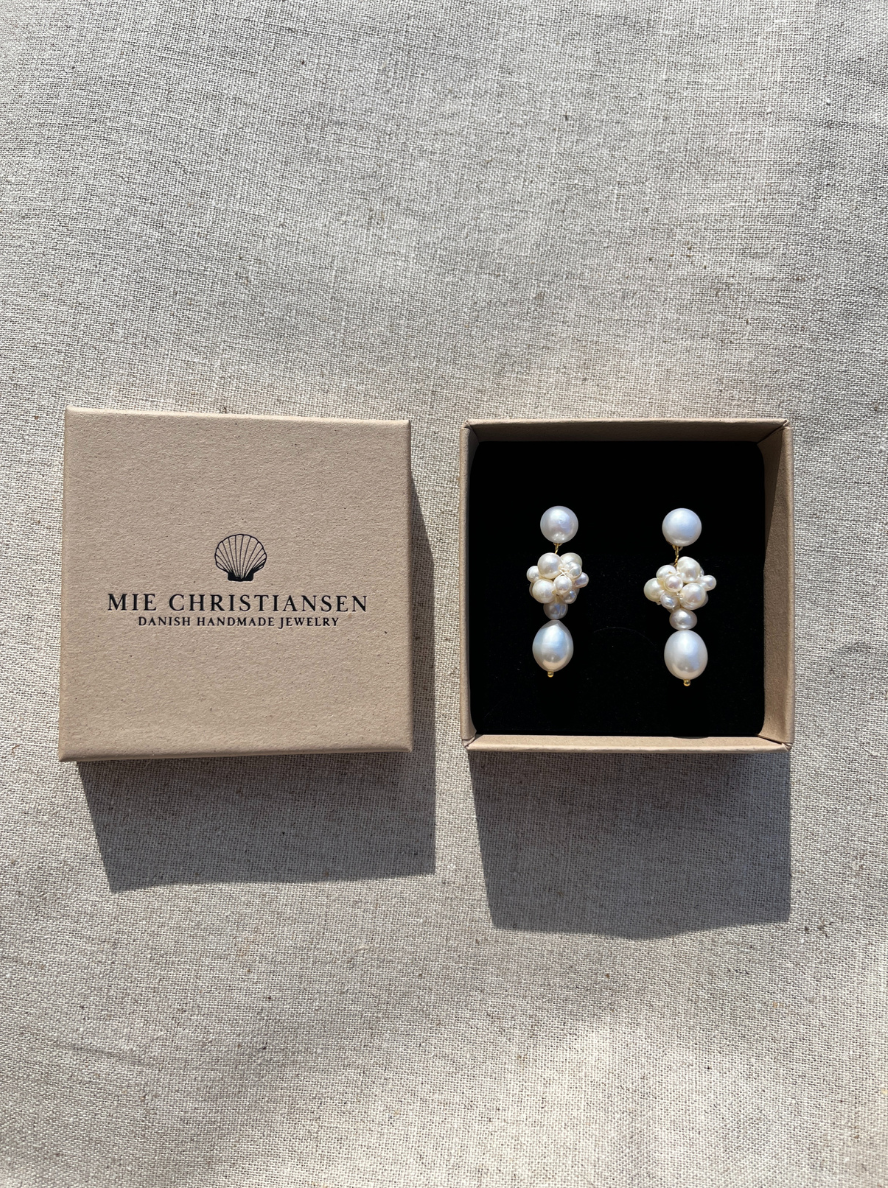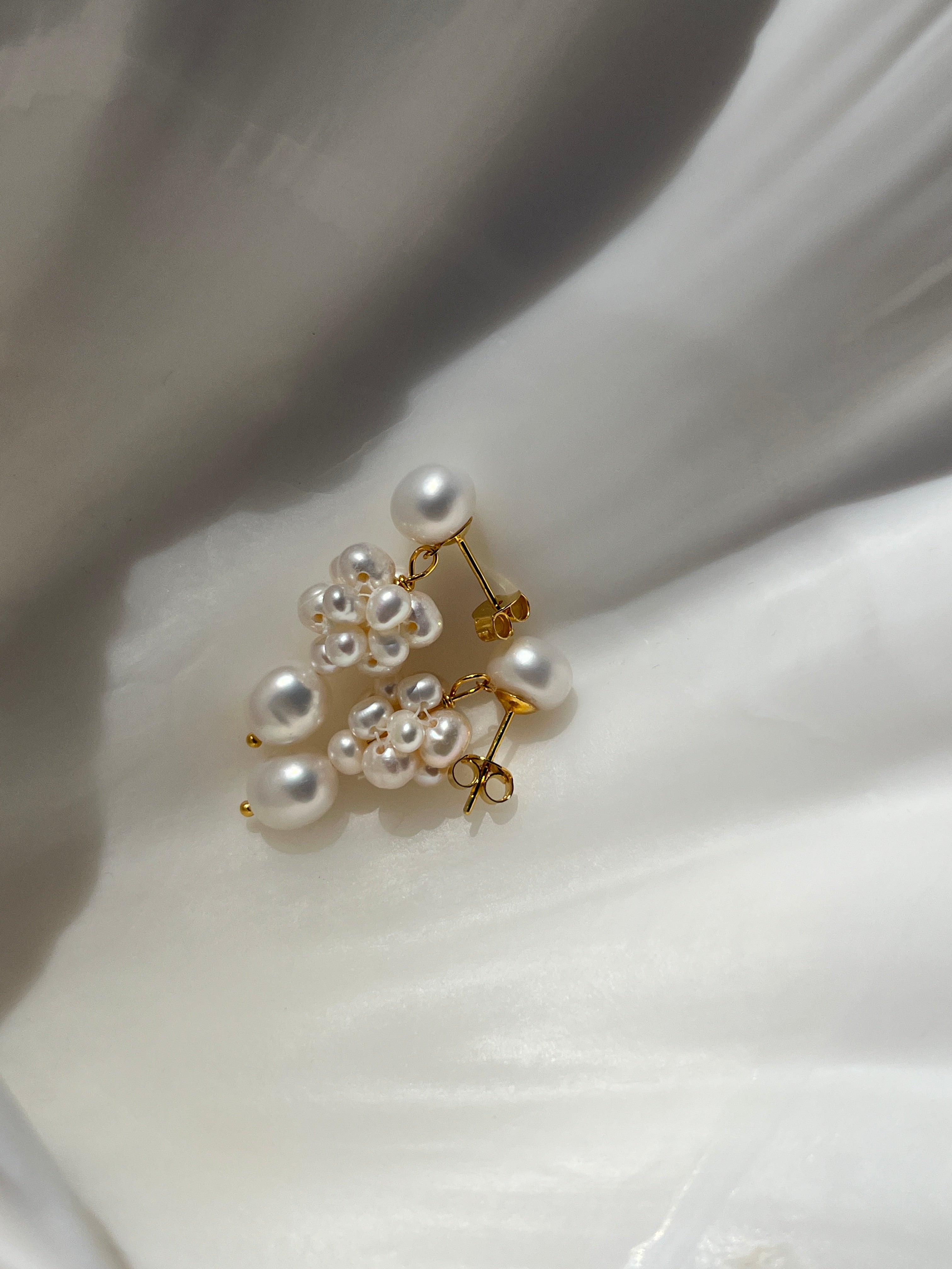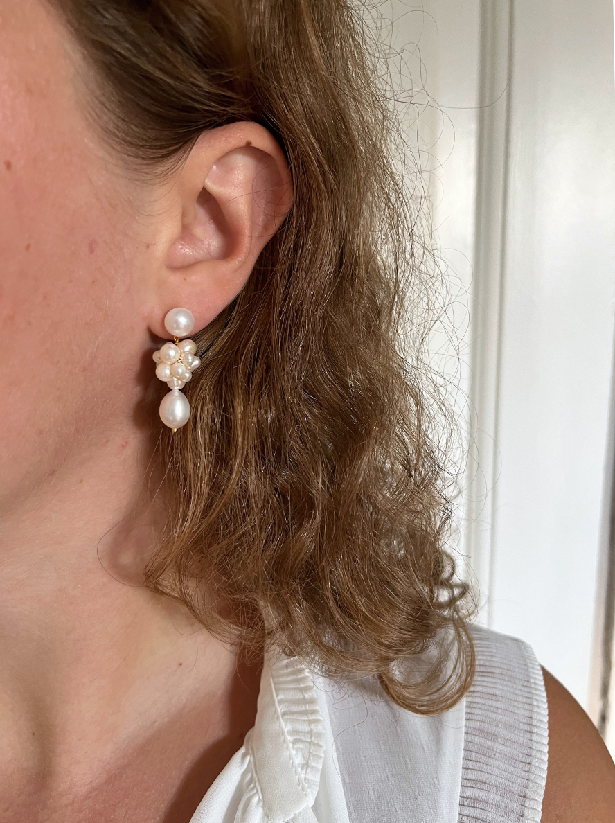 Cleora er en drømmende sammensætning af ferskvandsperler arrangeret i en elegant, organisk form, der skaber et sofistikeret og tidløst udtryk. Øreringene er håndlavet og midterklasen af perler er sat sammen med en hvid tråd.