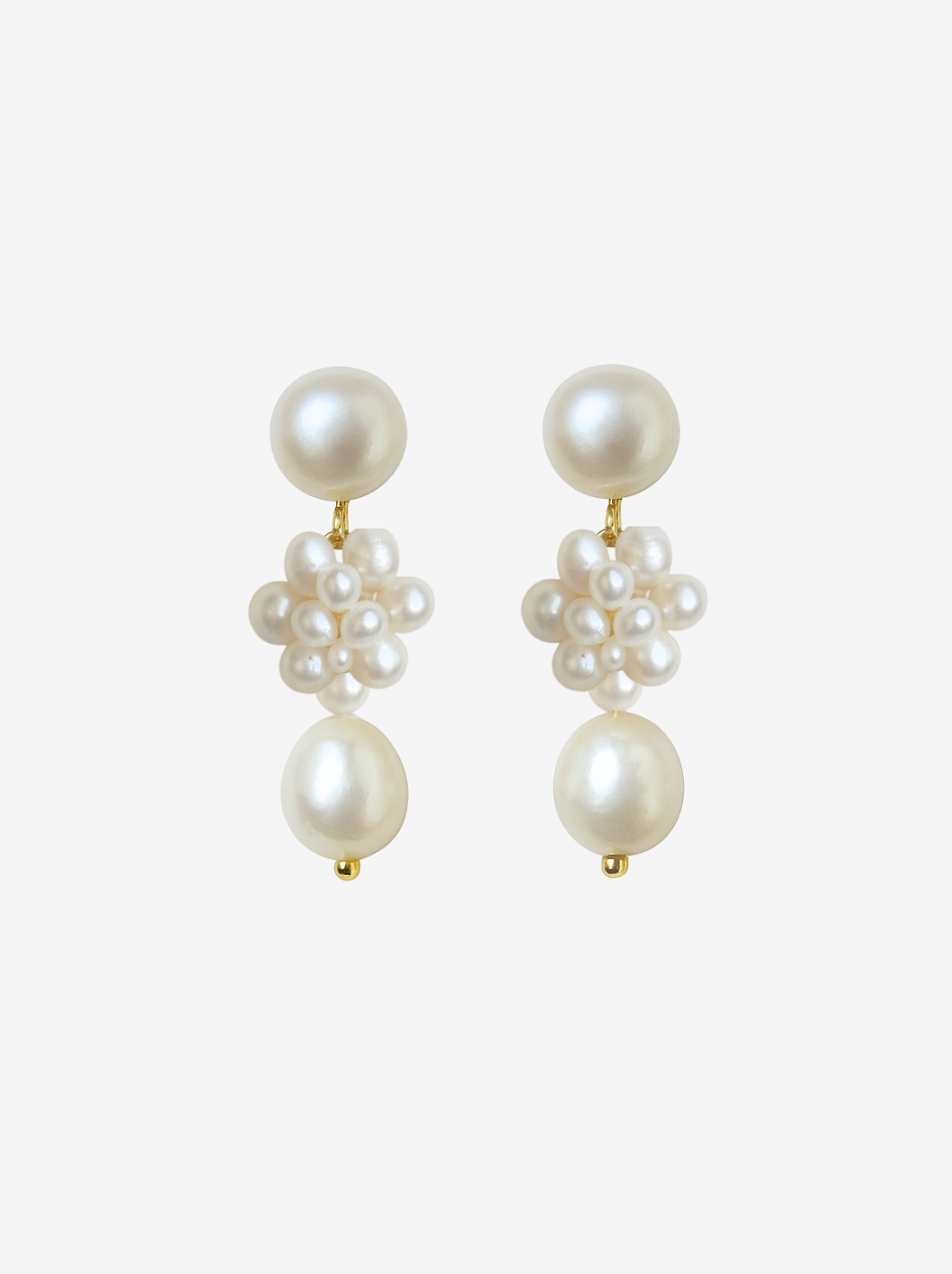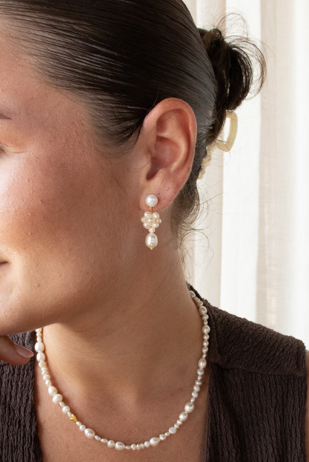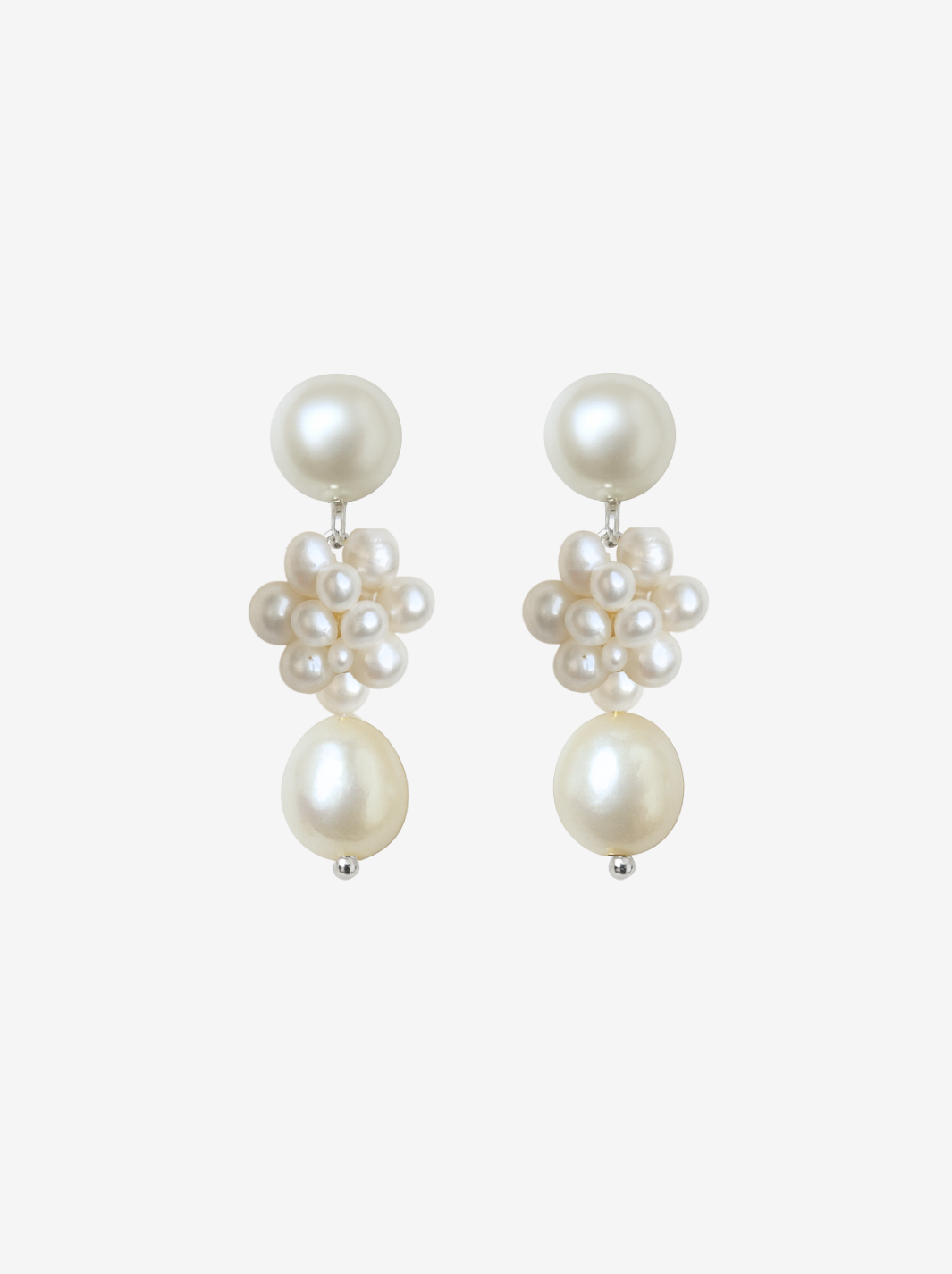 Cleora er en drømmende sammensætning af ferskvandsperler arrangeret i en elegant, organisk form, der skaber et sofistikeret og tidløst udtryk. Øreringene er håndlavet og midterklasen af perler er sat sammen med en hvid tråd.