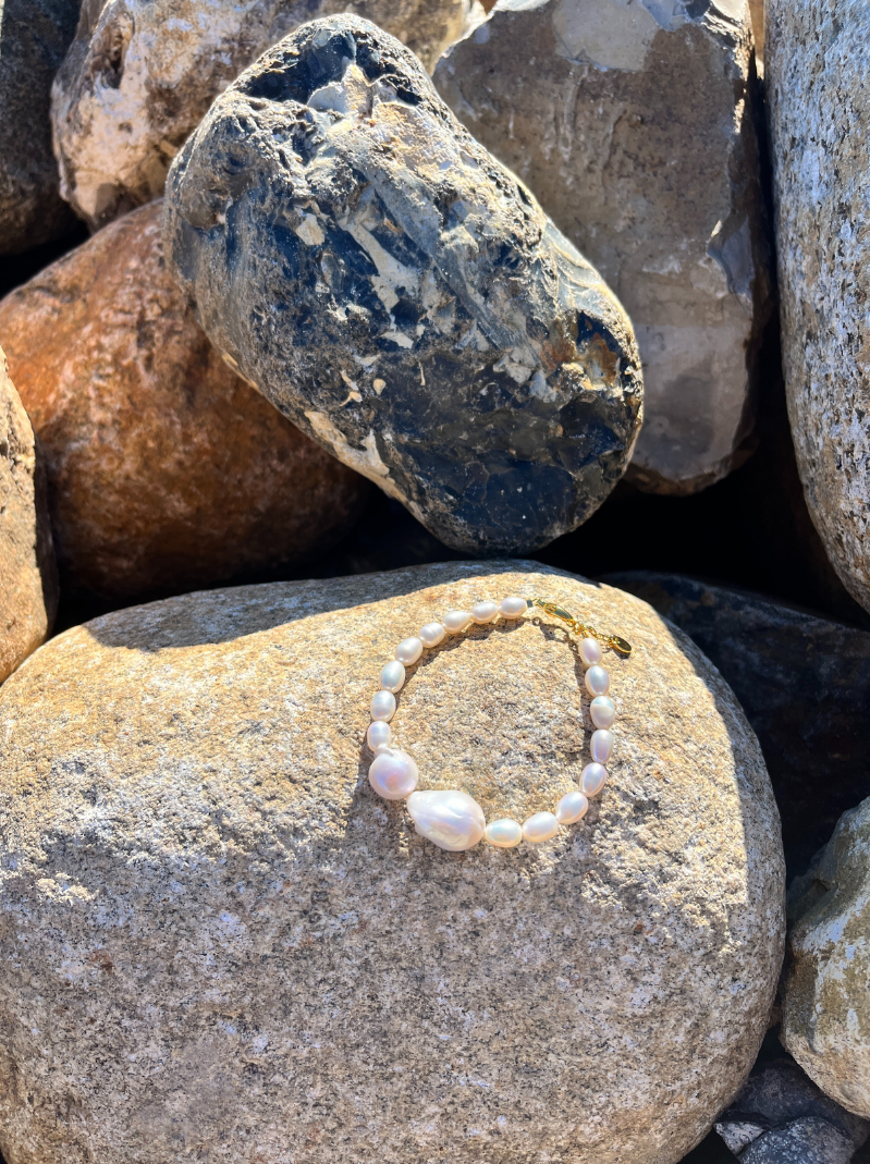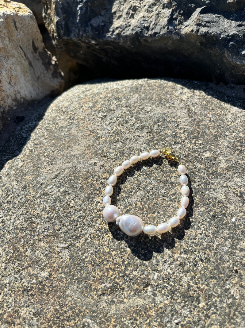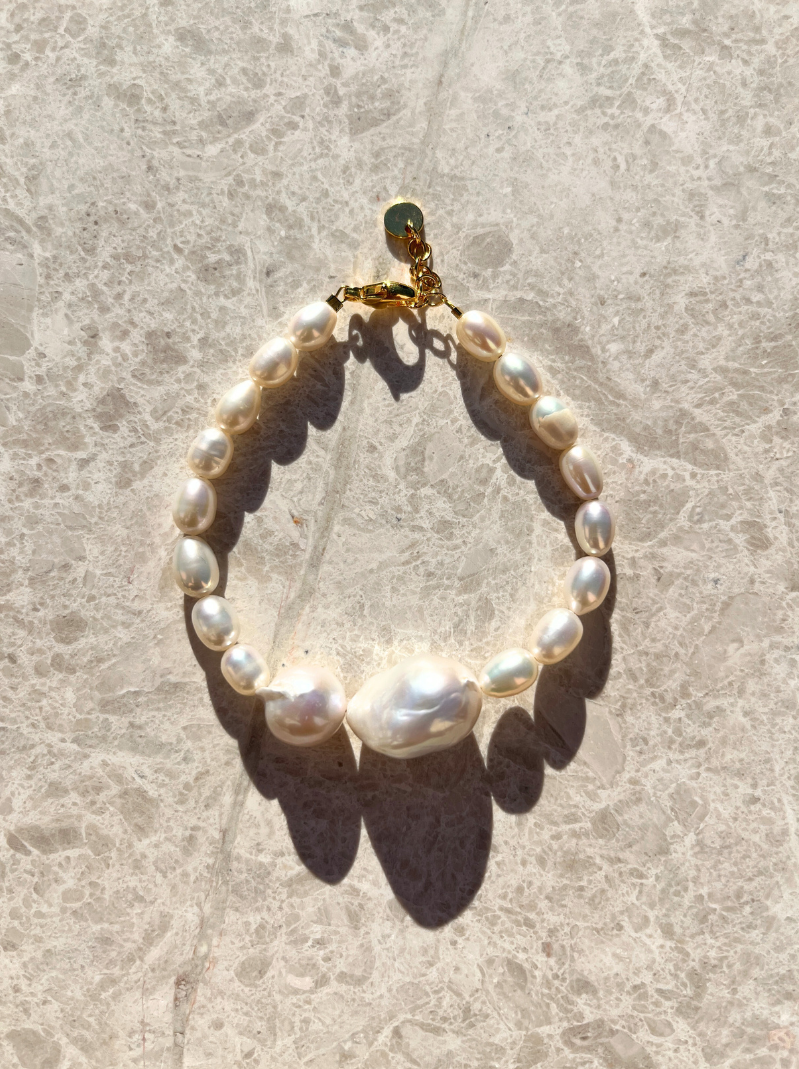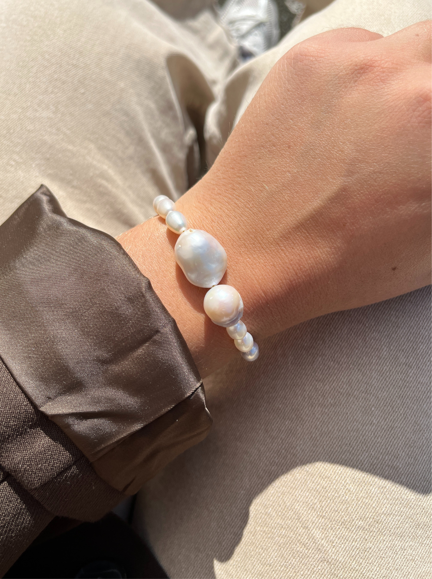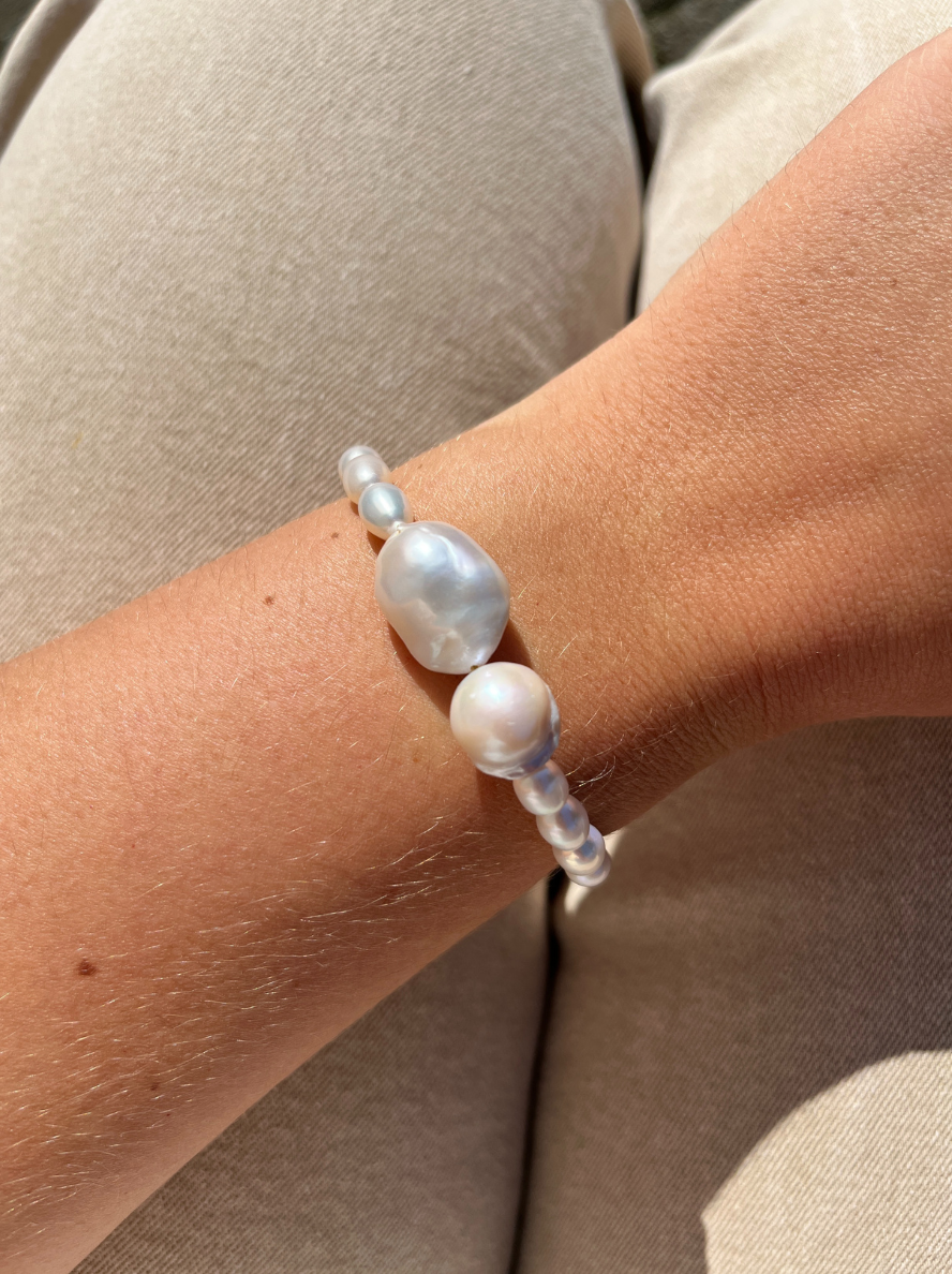 Maris forener klassisk charme og moderne elegance med en smuk række af naturlige ferskvandsperler. De to markante barokperler i midten tilføjer armbåndet et unikt udtryk, der skiller sig ud med sin organiske form.