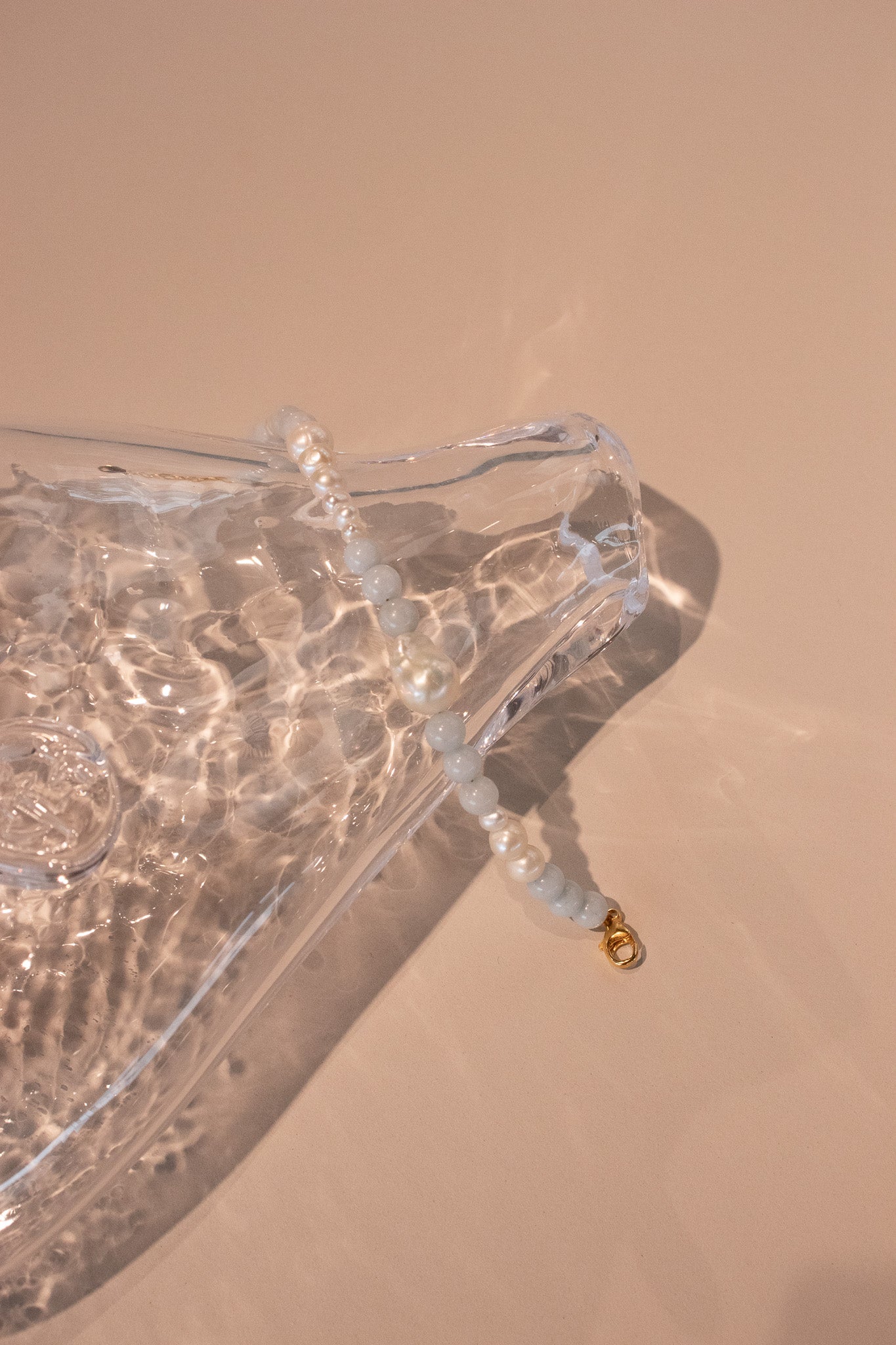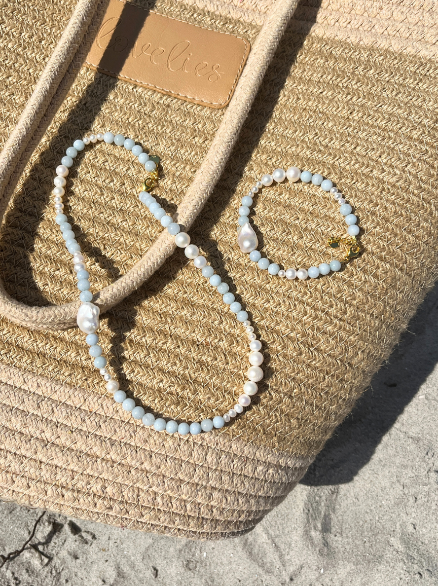 De blå kalcedonperler spejler lyset fra det græske øhav og giver smykket et roligt og legende udtryk.