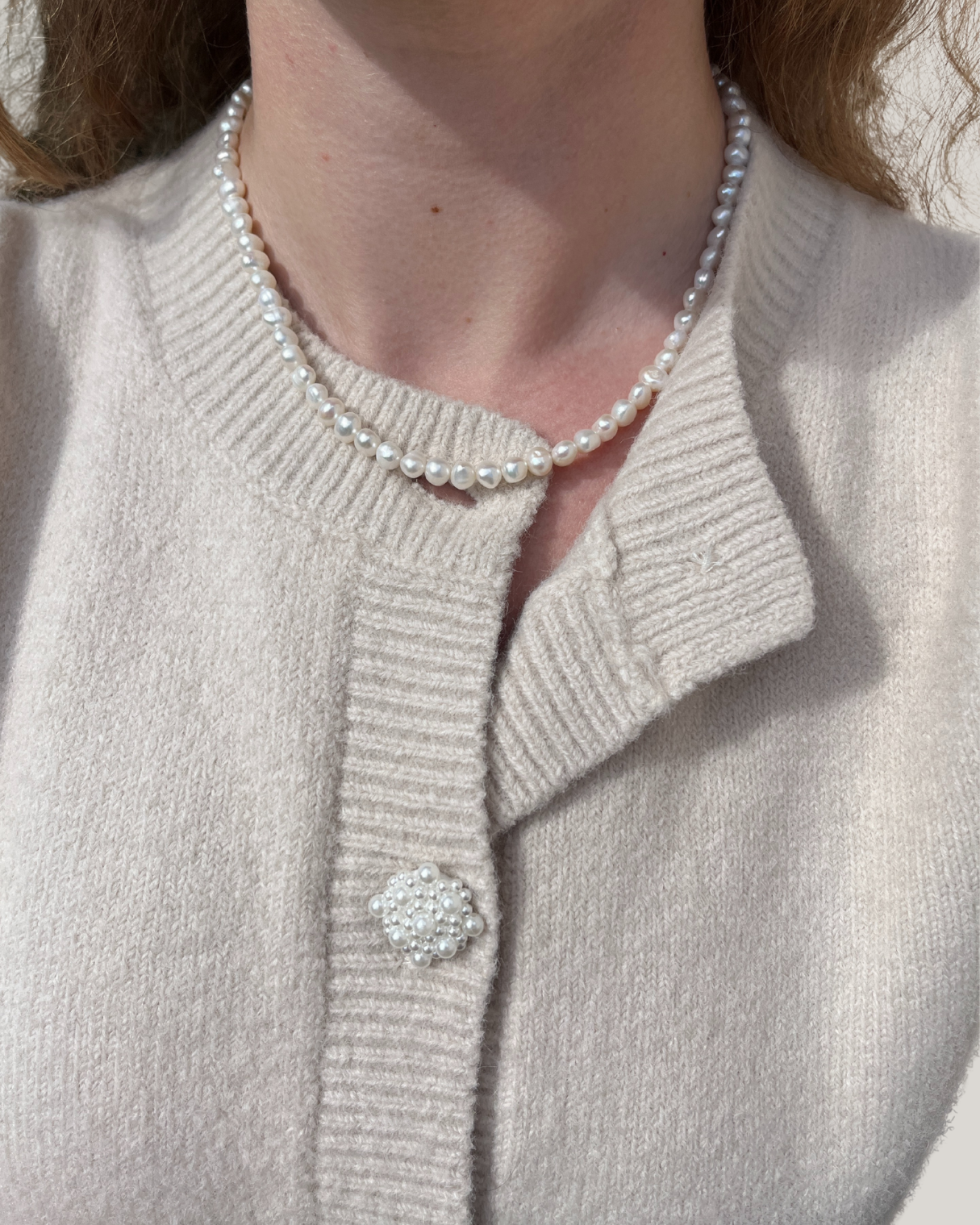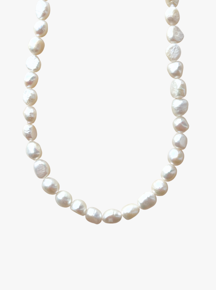 Adella Perlehalskæde består af mediumstørrelse ferskvandsperler og giver et rå og feminint look. Hver en halskæde har naturlige perler og dermed gør det hver en halskæde unik.