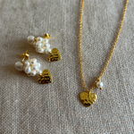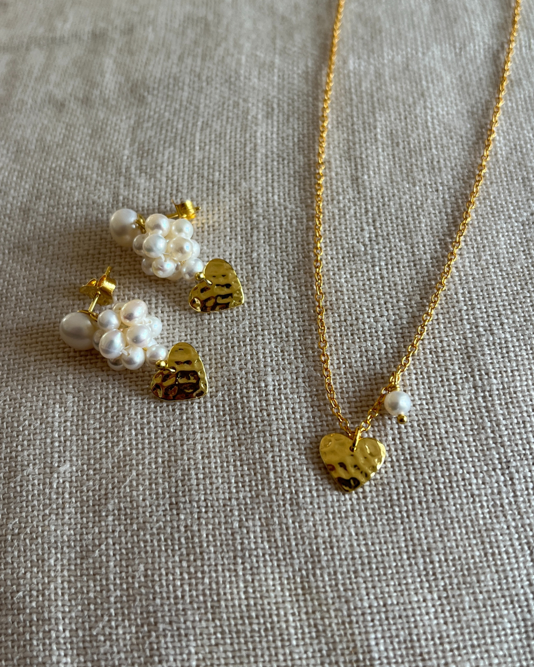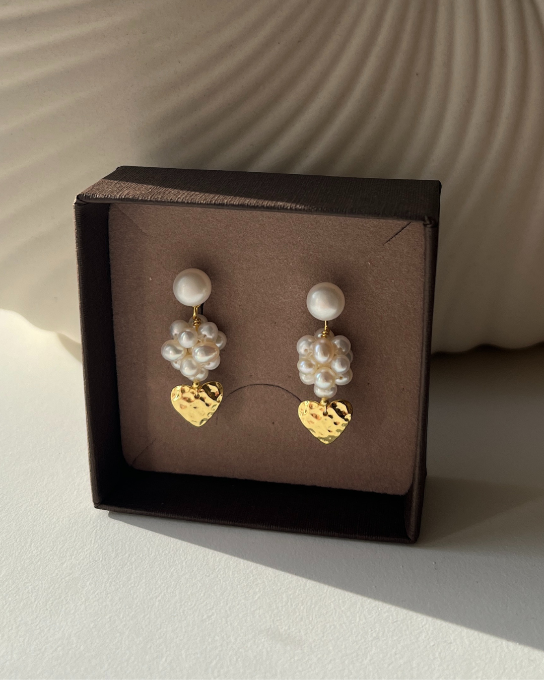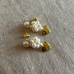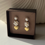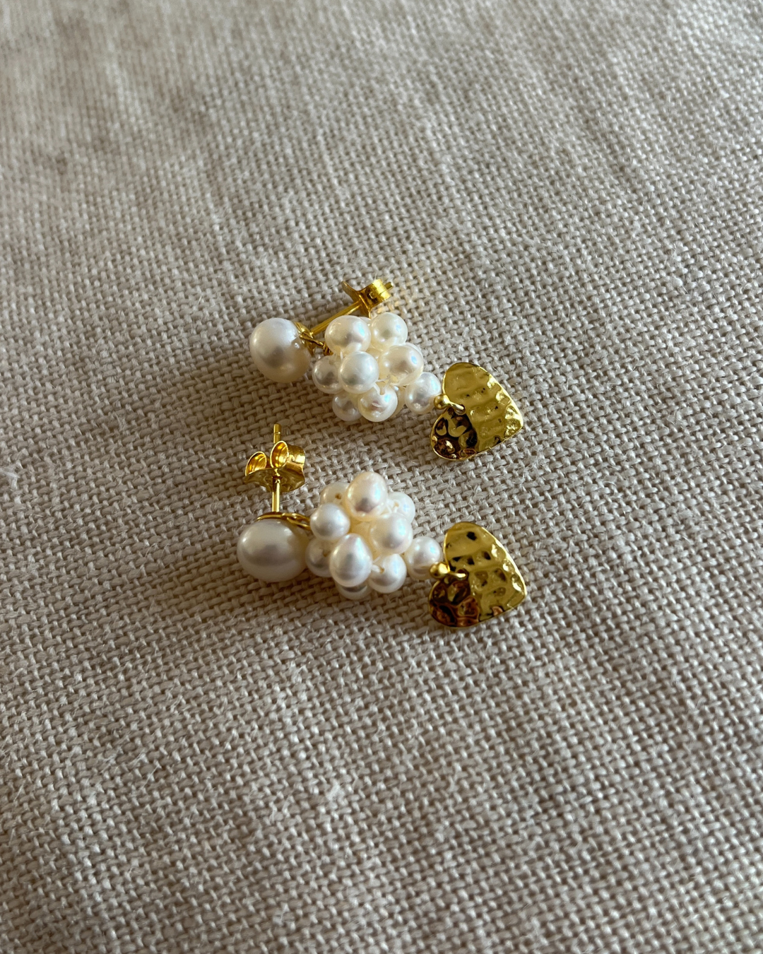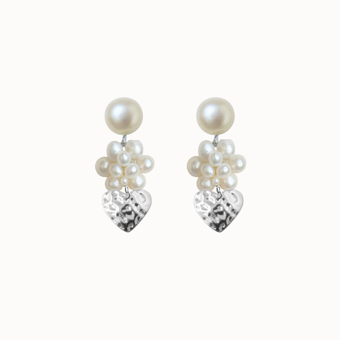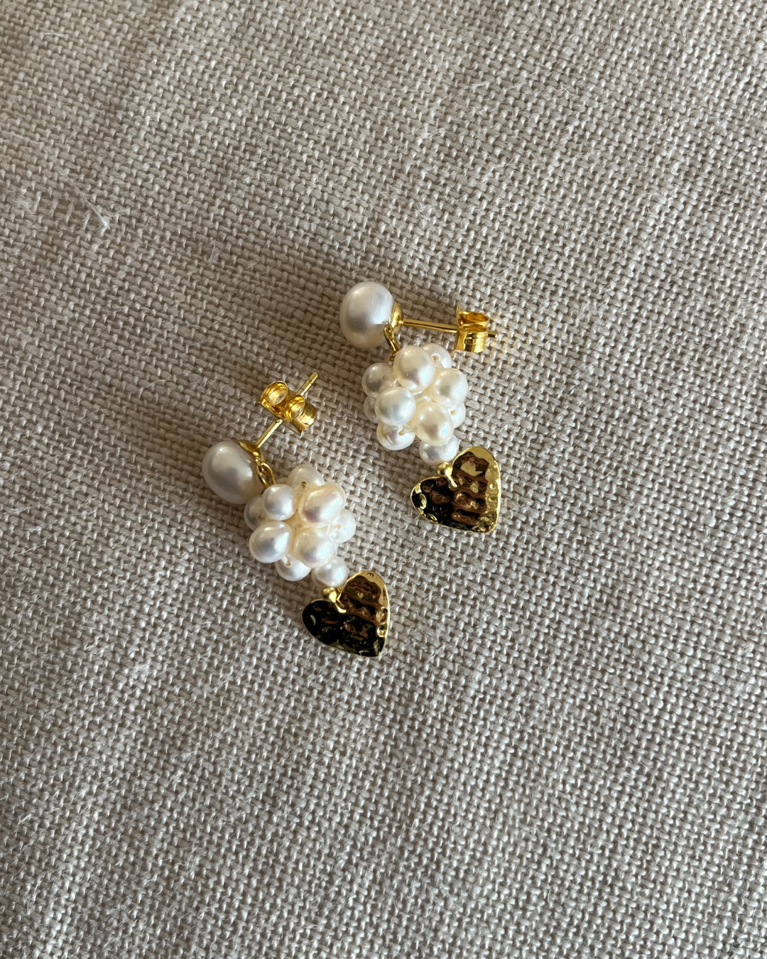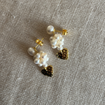 Bestseller perleørestikkere i en special udgave med hjertevedhæng. Et smukt og eksklusivt par i kærlighedens tegn med håndsyet perlebær.