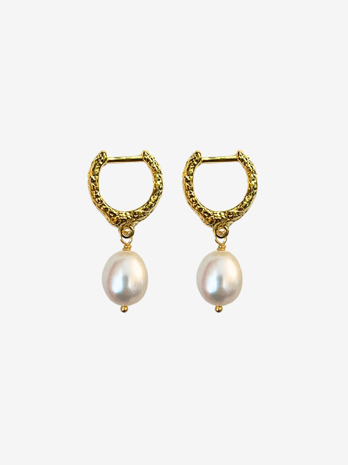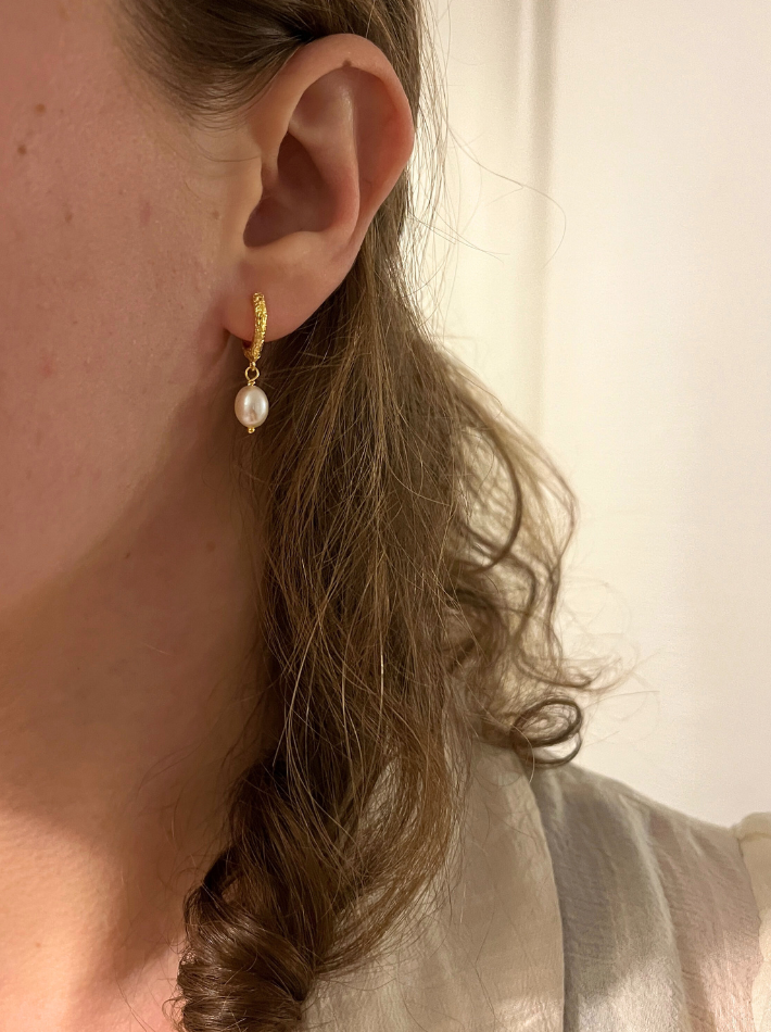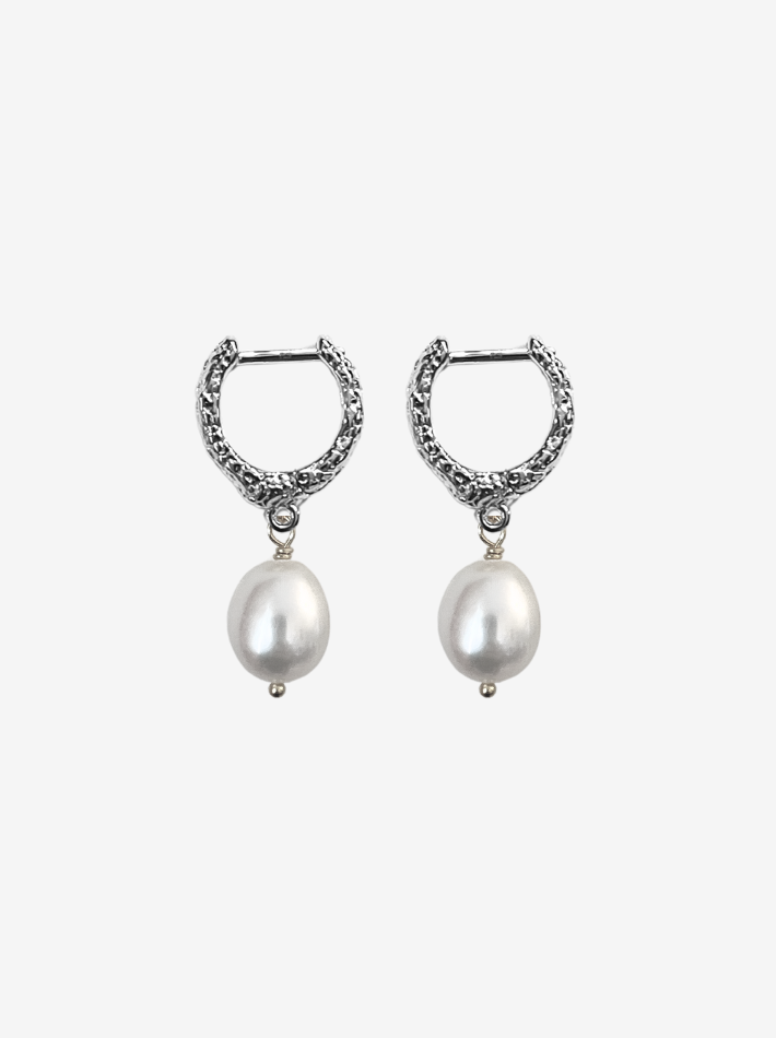 Elegante og raffinerede øreringe med ægte ferskvandsperler, der hænger fra detaljerede, teksturerede hoops. Det unikke design kombinerer en organisk struktur med den klassiske skønhed fra perler, hvilket giver et eksklusivt og tidløst udtryk. Perfekte til både hverdag og særlige anledninger.